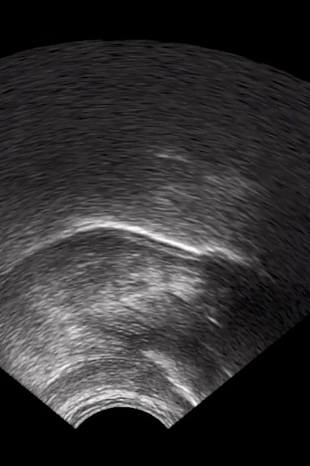 What are we looking at? We can perhaps discern from the greyscale fuzz, the varying degrees of white patches, fanning out from a point in shapes hard to parse, that this is an ultrasound display. But what are we trying to see in the scan? There is no baby or foetal development, no heart, no kidney, no liver, no needle to pierce through the night like a ship. But it moves in time with a voiceover. A mouth, surely? Yes. We are, quite literally, mechanically, watching someone speak.