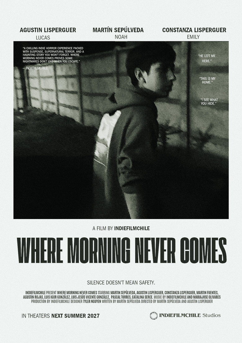 Martín Sepúlveda es un actor chileno en formación. Desde temprana edad ha mostrado un fuerte interés por el cine y la actuación, participando en proyectos teatrales y audiovisuales independientes. Fue protagonista en una obra histórica presentada ante público, experiencia que consolidó su decisión de dedicarse a la actuación. Actualmente esta en Where Morning Never Comes, participa como actor. Su trabajo se enfoca en el cine de terror psicológico y narrativas íntimas, explorando emociones, trauma y lo sobrenatural desde una mirada juvenil y autoral. ___________________________________________ Martín Sepúlveda is a Chilean actor in training with a strong interest in cinema and performance from an early age. He has participated in independent theater and audiovisual projects, including a leading role in a historical stage production presented to a large public audience. He is currently developing his first independent feature film, Where Morning Never Comes, in which he also stars. His work focuses on psychological horror and intimate storytelling, exploring trauma, emotion, and the supernatural through a youthful and personal perspective.